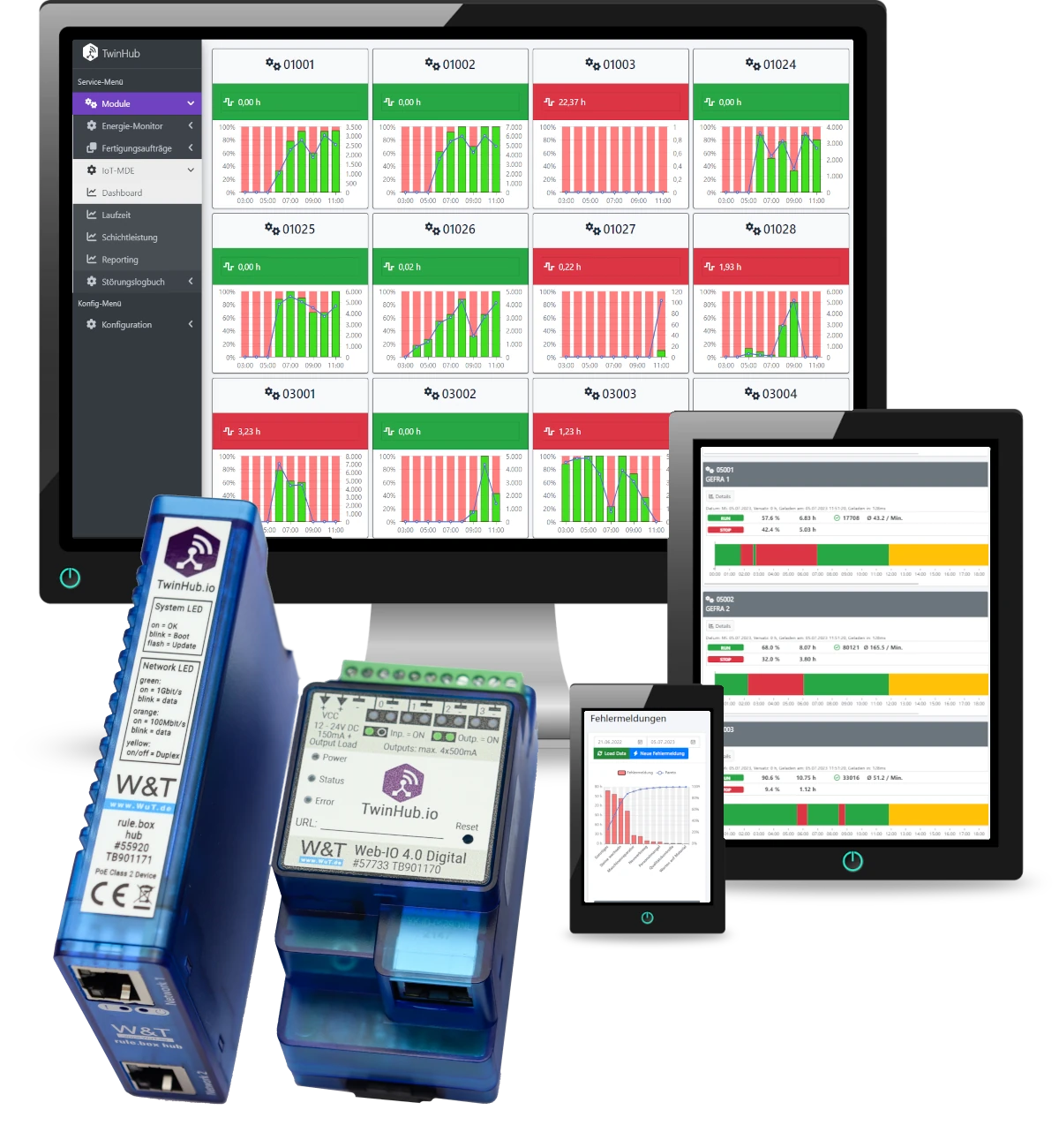 Mit TwinHub behalten Sie jederzeit und von überall den Überblick über Ihre Fertigung. Ob Sie unterwegs sind und Ihr Smartphone nutzen oder sich in der Halle vor Ort befinden und den Monitor verwenden – TwinHub bietet Ihnen eine nahtlose Integration in Ihren Produktionsalltag. Selbst ältere Maschinen können problemlos mit der IIoT-MDE nachgerüstet werden. Die Plattform ist leicht zu bedienen, verfügbar in mehreren Sprachen und fokussiert sich auf die wesentlichen Funktionen, die Sie für eine effiziente Fertigung benötigen.